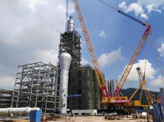 图为4000吨履带吊在吊装LLDPE装置反应器