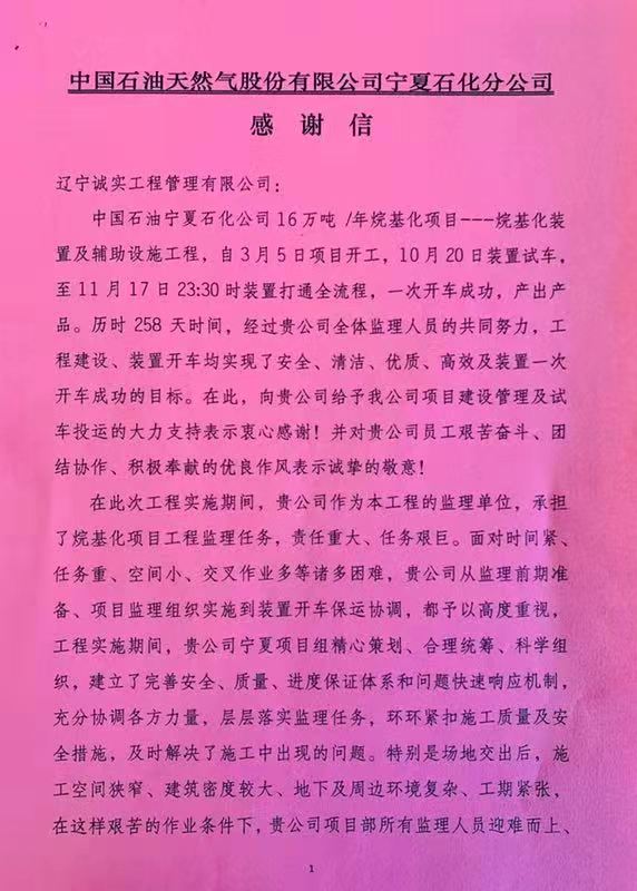 信中,中国石油天然气股份有限公司宁夏石化分公司对我公司及项目监理人员的工作十分满意,给予了很高的评价与肯定,并表示衷心的感谢。