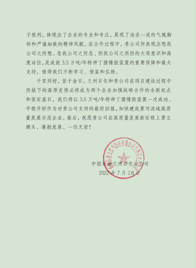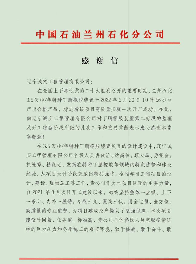 近日,由我公司监理的中国石油天然气股份有限公司兰州石化分公司--3.5万砘/年特种丁腈橡胶项目喜获业主表扬信。表扬信充分肯定了诚实监理的工作成果,对驻兰州项目部全体监理工程师在项目建设过程中所付出的努力表示由衷的感谢。