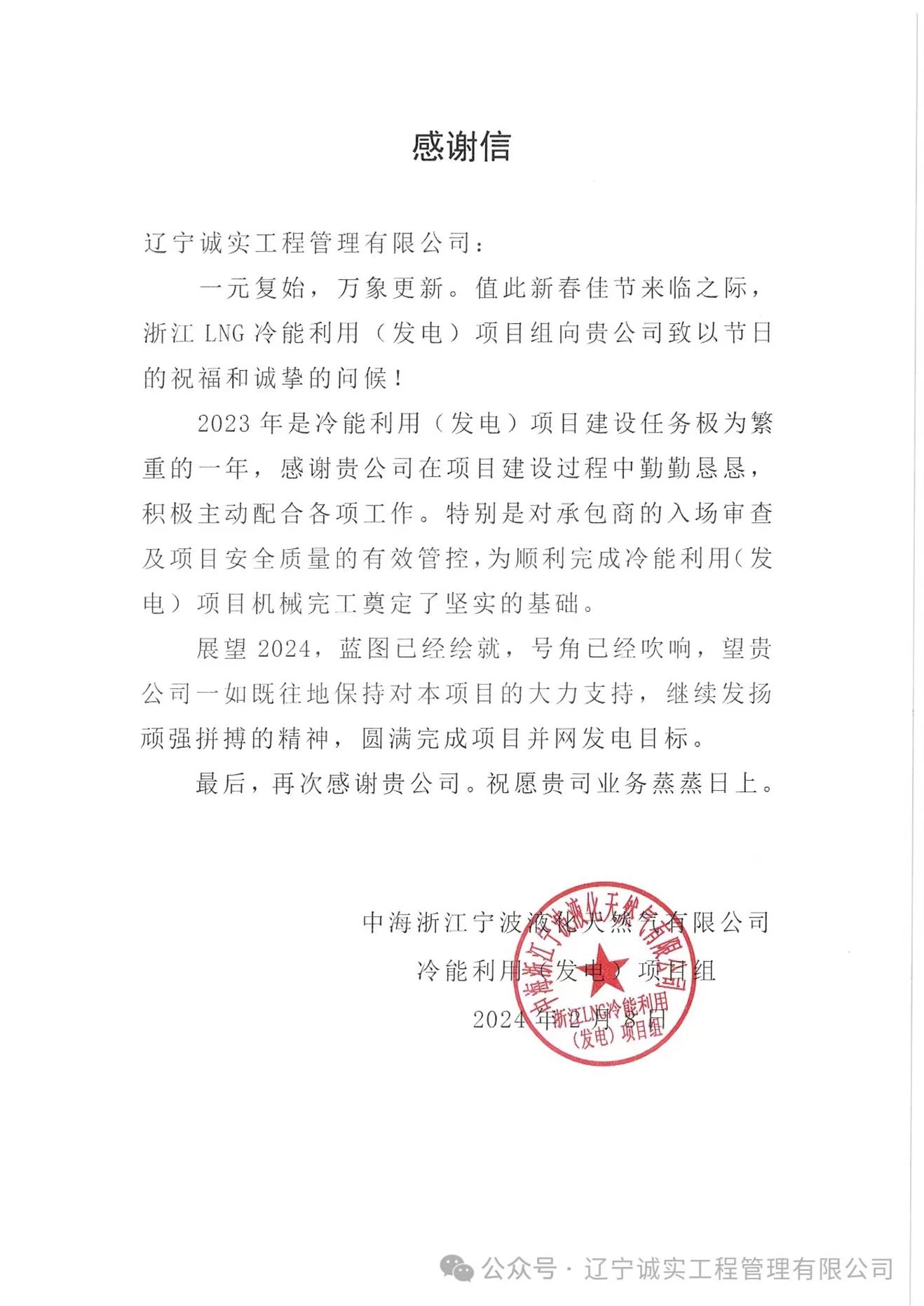 浙江LNG冷能利用(发电)项目组向公司发来了感谢信,信中肯定了公司项目部人员在2023年的努力,特别是对于承包商入场审查及项目安全质量的有效管控,为项目机械完工奠定了坚实的基础。该项目是积极响应国家及浙江省“十四五”规划的节能减排政策,落实“绿色低碳”发展战略的示范项目,项目投产后,预计年净发电量约为2408万度,节省标准煤超3000tce,年减少CO₂排放可达18000多吨。展望2024年,项目部在黄思敏总监的带领下,将认真执行监理职责,积极推进项目建设,争取项目早日建成投产。