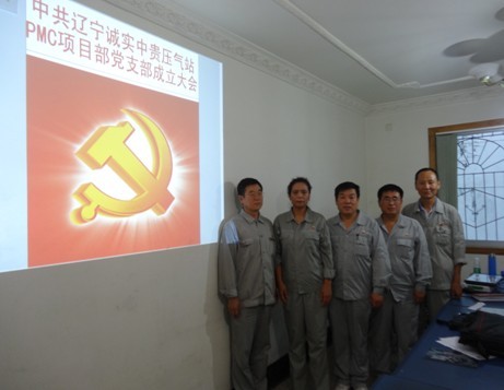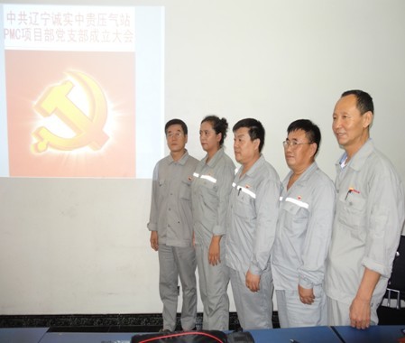 2013年7月21日辽宁诚实中贵线压气站PMC项目部党支部成立大会正式召开,大会由公司党委委员赵树环同志主持,首先介绍了了党支部成立的意义和目的,然后进入了大会流程。通过全体党员民主评议、选举,盛孝福同志当选为PMC项目部党支部书记,师兴华同志当选为党支部组织委员,胡德林同志当选为党支部宣传委员,赵树环同志代表公司党委对党支部成立表式祝贺。党支部全体党员在党旗下进行了郑重宣誓,最后由党支部书记作表态发言。