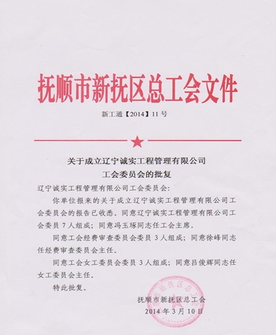 经过近两个月的筹备,诚实工会现已履行完毕各个筹备程序,抚顺市新抚区总工会已正式批准成立B体育手机官方网站入口工会委员会。公司工会由7名委员组成,下设经费审查委员会和女工委员会。公司工会将根据机关及项目部的实际情况,相应成立工会分会和工会小组,发挥工会在企业中的积极作用,为企业的发展做出贡献。