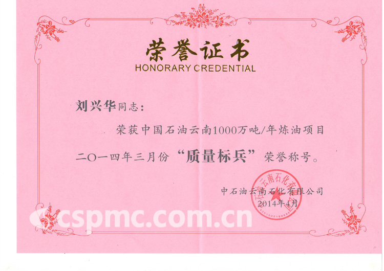 刘兴华同志荣获中国石油云南1000万吨/年炼油项目2014年3月份“质量标兵”荣誉称号