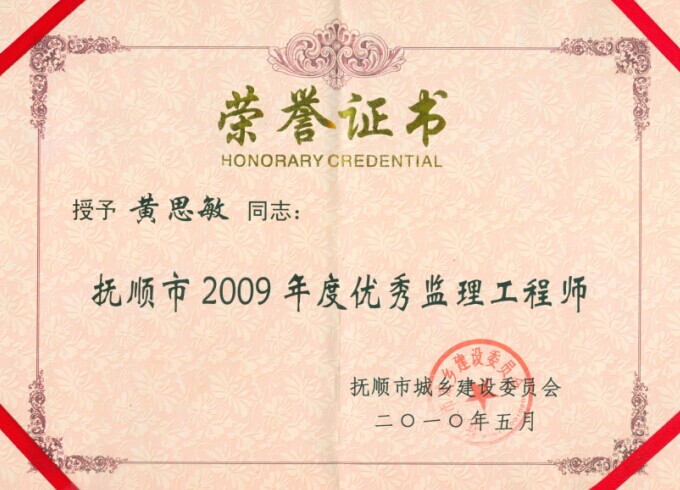 黄思敏同志被评为抚顺市年度优秀监理工程师