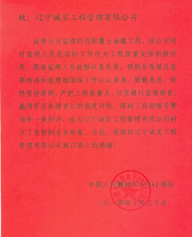信中,中国人民解放军65142部队对我公司及项目监理人员表示衷心的感谢。我公司项目监理人员能够认真负责地工作,切实履行监理职责,并且对该项目的总监理工程师郭松涛同志与工程师杨国栋同志提出了表扬。为此军区各级首长给予了高度评价,得到了65142部队领导的赞扬和一致好评!
